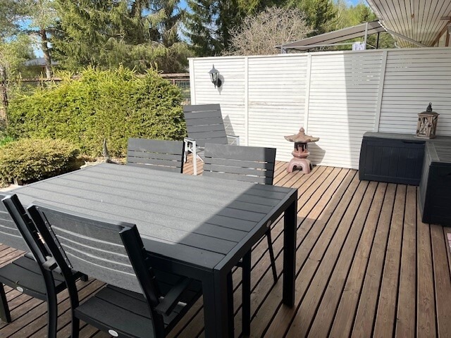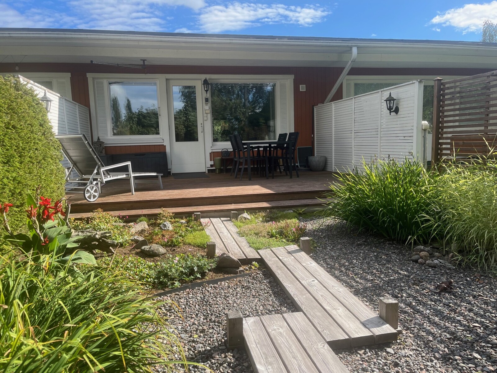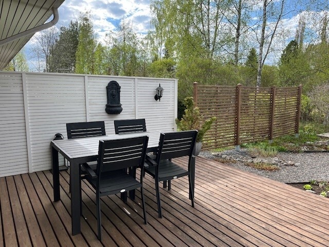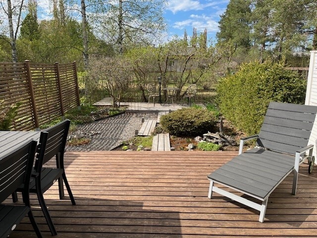 Olohuoneesta on käynti tilavalle kestopuuterassille ja kauniisti laitetulle pihalle. Kesäaikaan se on suojaisa pieni paratiisi!