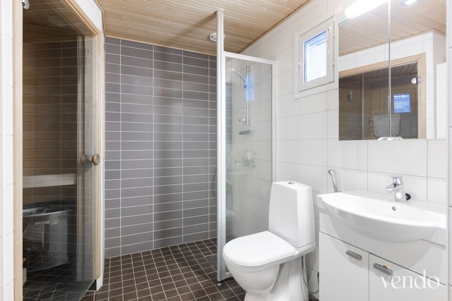 - WC-istuin, suihku, suihkuseinä, pesukoneliitäntä, peilikaappi, pesuallas, allaskaappi, bidee-suihku, ja kaapisto