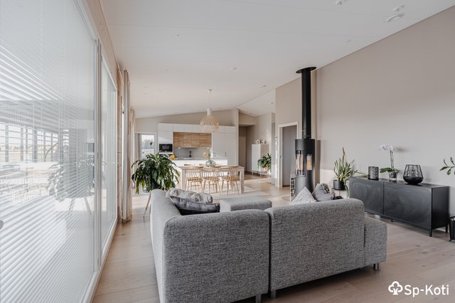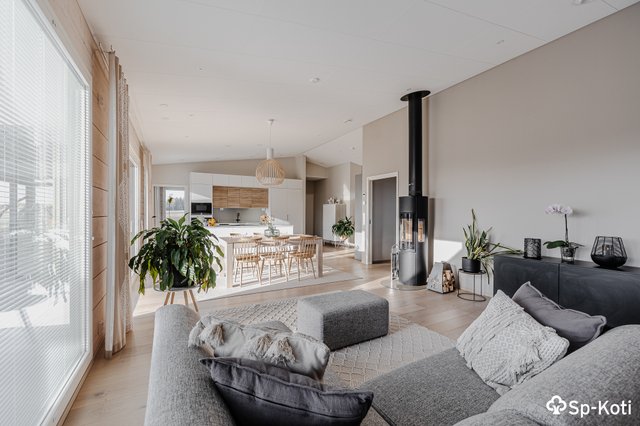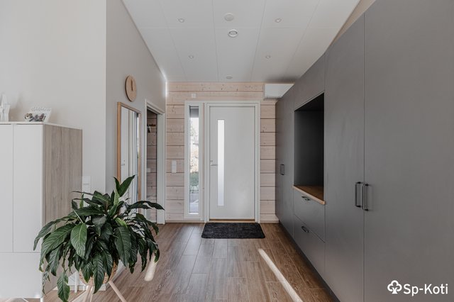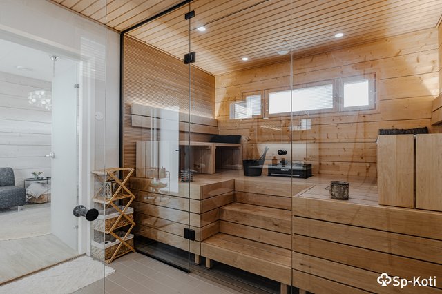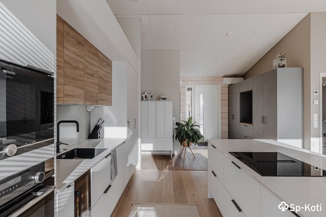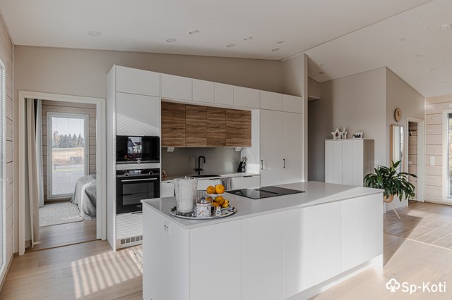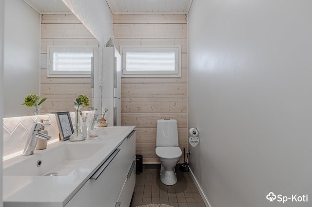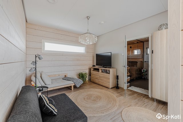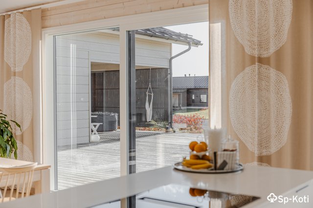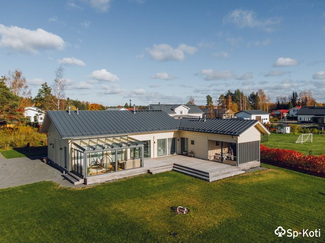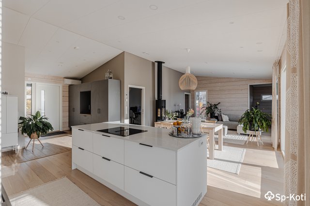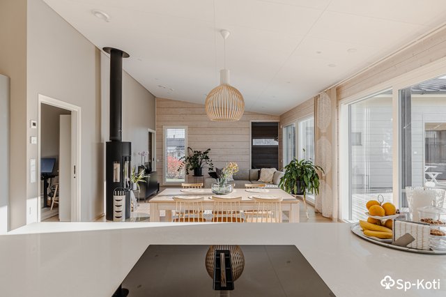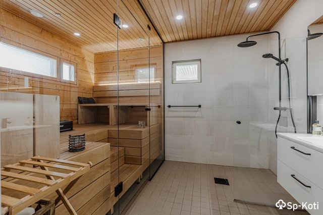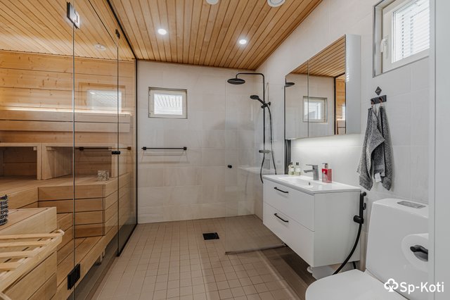 Tämän kodin loistava pohjaratkaisu pitää sisällään kolme makuuhuonetta. Päämakuuhuoneessa arjen ylellisyyttä tuo oma walk In closet vaatehuone. Kolmen makuuhuoneen lisäksi talosta löytyy ns. erillinen tv-huone / oleskeluhuone. Tilava sisääntulo eteinen helpottaa lapsiperhearkea. Erittäin tyylikäs keittiö on varustettu saarekkeella, kvartsitasoin ja laadukkailla Siemensin kodinkoneilla ja viinikaapilla. Ruokailutila yhdistyy saumattomasti keittiöön ja olohuoneeseen, luoden avaran tilan yhteisille hetkille. Korotetut sisäkatot ja isot ikkunat tekevät tiloista avaran ja valoisan. Kodinhoitotiloissa reilusti kaappi- ja tasotilaa, paikka pesutornille ja oma ulko-ovi. Erillisen wc:n lisäksi pesutilojen yhteydessä myös wc-istuin. Pesutilojen yhteydestä löytyy myös oma sauna, jossa arjen huolet ja murheet unohtuvat hetkessä.  Takapihalla runsaasti avointa, että katettua oleskelutilaa – ja lisäksi tilava erillinen lasitettu terassi.