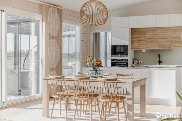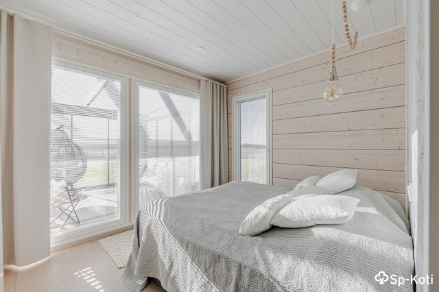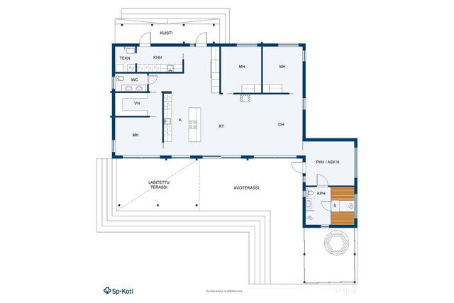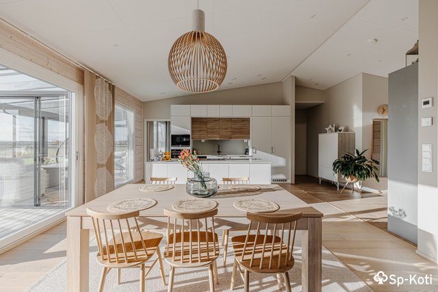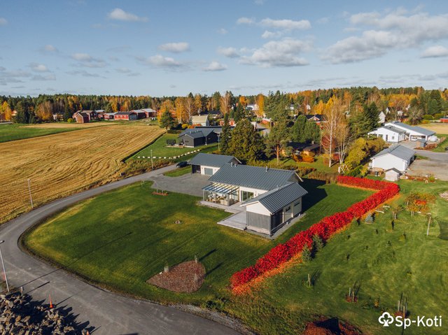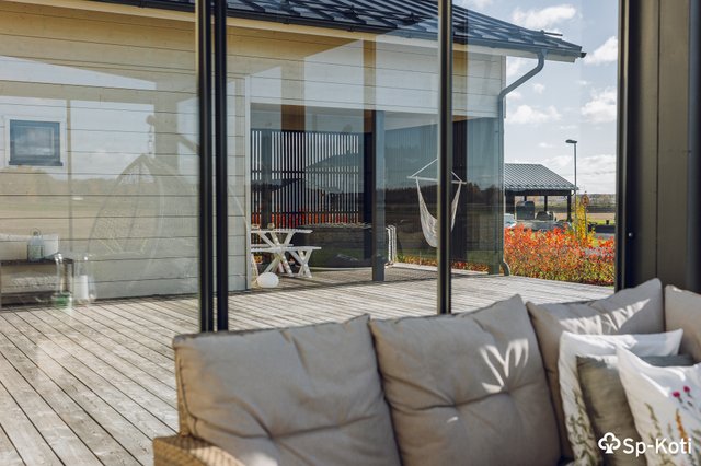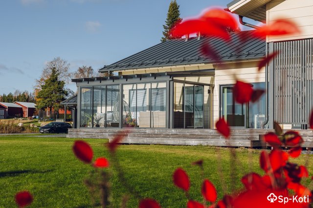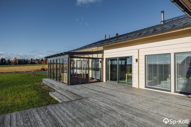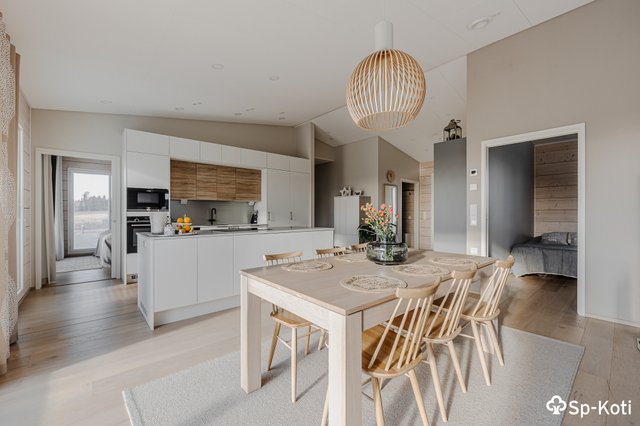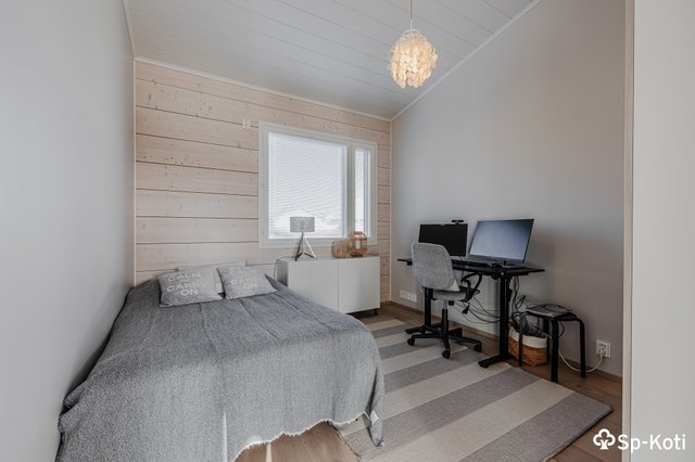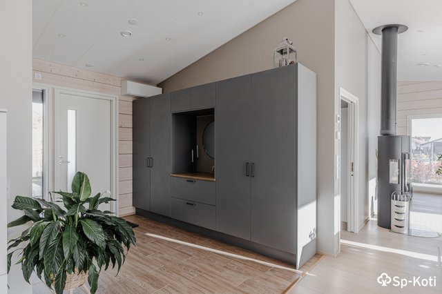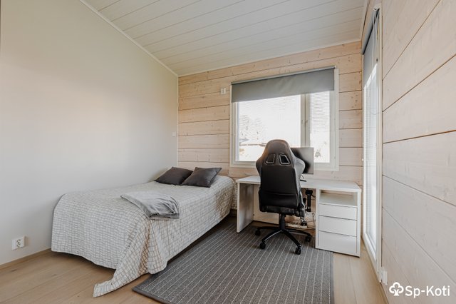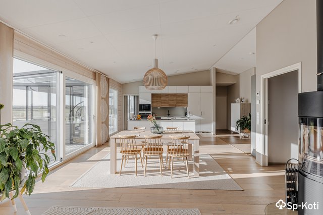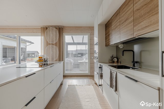 Tämän kodin loistava pohjaratkaisu pitää sisällään kolme makuuhuonetta. Päämakuuhuoneessa arjen ylellisyyttä tuo oma walk In closet vaatehuone. Kolmen makuuhuoneen lisäksi talosta löytyy ns. erillinen tv-huone / oleskeluhuone. Tilava sisääntulo eteinen helpottaa lapsiperhearkea. Erittäin tyylikäs keittiö on varustettu saarekkeella, kvartsitasoin ja laadukkailla Siemensin kodinkoneilla ja viinikaapilla. Ruokailutila yhdistyy saumattomasti keittiöön ja olohuoneeseen, luoden avaran tilan yhteisille hetkille. Korotetut sisäkatot ja isot ikkunat tekevät tiloista avaran ja valoisan. Kodinhoitotiloissa reilusti kaappi- ja tasotilaa, paikka pesutornille ja oma ulko-ovi. Erillisen wc:n lisäksi pesutilojen yhteydessä myös wc-istuin. Pesutilojen yhteydestä löytyy myös oma sauna, jossa arjen huolet ja murheet unohtuvat hetkessä.  Takapihalla runsaasti avointa, että katettua oleskelutilaa – ja lisäksi tilava erillinen lasitettu terassi.
