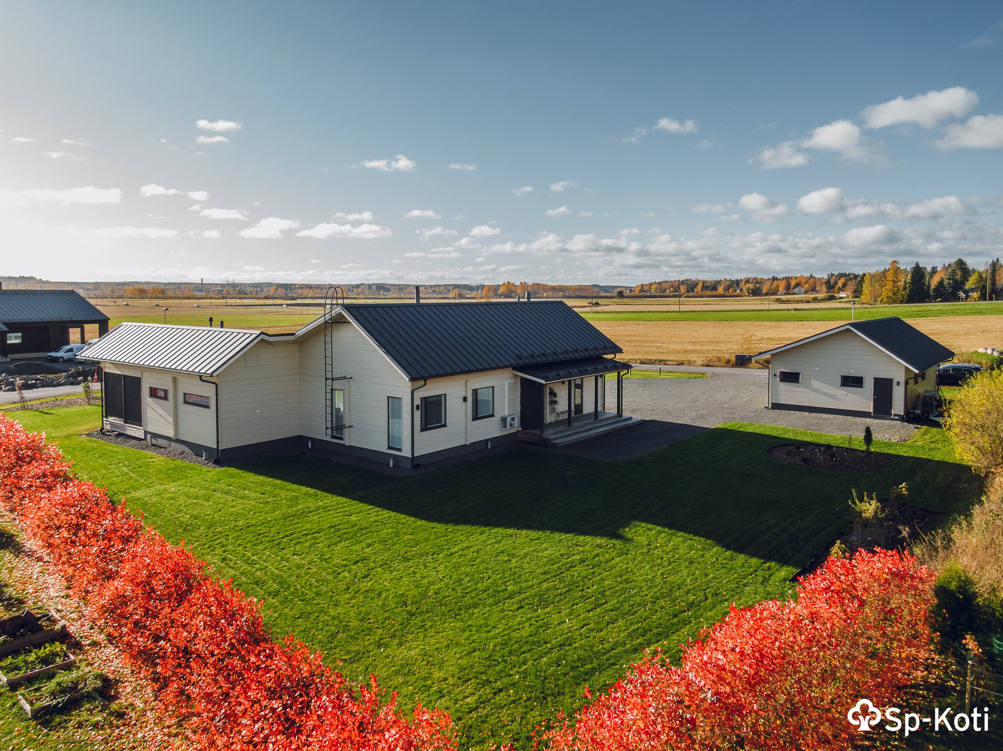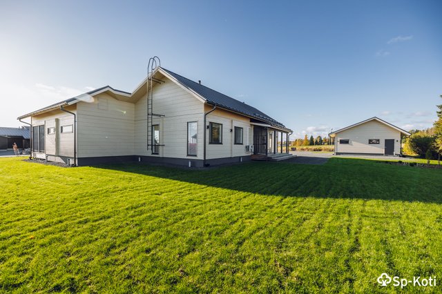 - Talousrakennus, jossa yhdelle autolle katospaikka, lämmin autotalli (32,50 m²) varustettuna sähköisellä nosto-ovella ja lattiakaivolla sekä kaksi lämmintä varastoa (5,90 m² ja 5,90 m²). Rakennuspiirustusten mukaan talousrakennuksen kerrosala on 53,00 m². Talousrakennuksen lämmitys myös maalämmöllä. Talousrakennuksen käyttöönottokatselmus on pidetty 03.11.2022 ja loppukatselmus on pidetty 20.10.2025