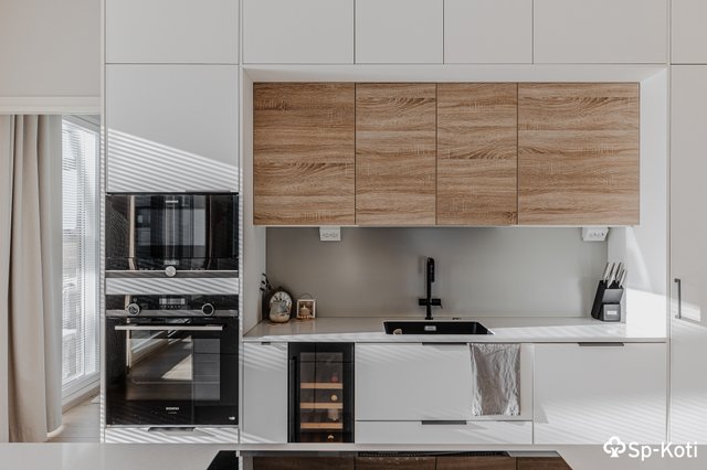 - Jääkaappi, erillinen pakastin, erillisuuni, astianpesukone, liesi (Induktioliesi integroidulla liesituulettimella.), mikroaaltouuni, ja viinikaappi