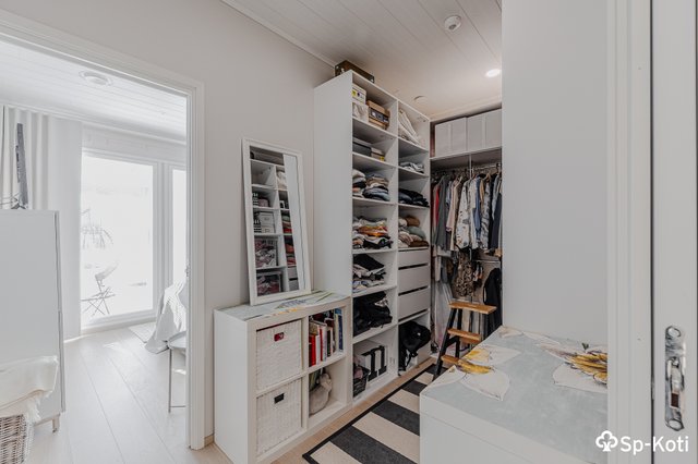- Talousrakennuksen yhteydessä kaksi erillistä lämmintä varastoa. Päämakuuhuoneen yhteydessä oma tilava "walk in closet" vaatehuone. Kiinteitä kaapistoja on runsaasti.