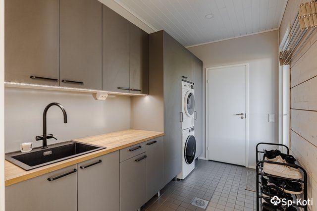 - Pesuallas, lattiakaivo, lattialämmitys, pyykkikaapit, pesukoneliitäntä, tila pesutornille, ja pöytätaso