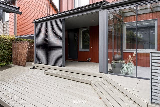 Olohuoneesta on käynti tilavalle lasitetulle terassille sekä kauniille piha-alueelle. Lisää terassitiloja löytyy talon sivustalta, jonne on käynti kylpyhuoneesta.