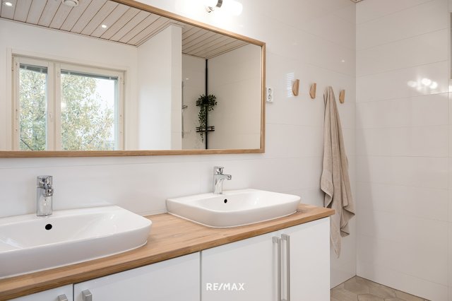 - Alakerran kylpyhuoneessa lattia ja seinät laattaa, kaksi suihkua, peili, allaskaappi, lattialämmitys. Yläkerran kylpyhuoneessa / kodinhoitohuoneessa kaapistot, suihku, suihkuseinä, kaksi allasta, allaskaappi, työtastot laminaattia, pesukoneliitäntä, lattialämmitys.