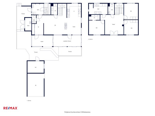 - Asuintilojen pinta-alaan 151m2 (huoneistoala) on laskettu mukaan alakerrassa avokeittiö, ruokailutila, olohuone, kylpyhuone, sauna, apukeittiö/varasto, wc. Yläkerrassa kolme makuuhuonetta, aulatila, wc-tila, kodinhoitohuone, vaatehuone. Muihin tiloihin 10m2 on laskettu mukaan kylmä varastotila 10m2 (kerrosala 12m2) Lisäksi kiinteistöllä sijaitsee autokatos jonka kerrosala on 22m2. Ilmoitettu asuinpinta-ala on rakennuspiirustuksien mukainen huoneistoala, alakerta 72,8 m2 ja yläkerta 78,3 m2, yhteensä 151m2. Kerrosala 181,1m2 josta teknistä tilaa 5,3m2, Bruttoala 287m2. Rakennusoikeus 170k-m2 josta käytetty 175k-m2. Pinta-alaa ei ole tarkastusmitattu.