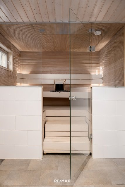 - Saunan seinät ja lauteet haapaa, lattia laattaa, sähkökiuas.