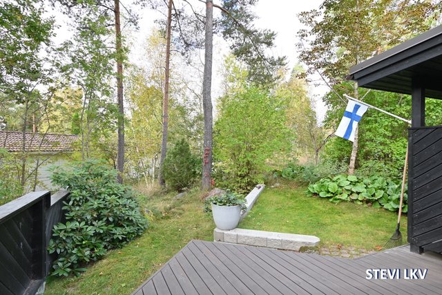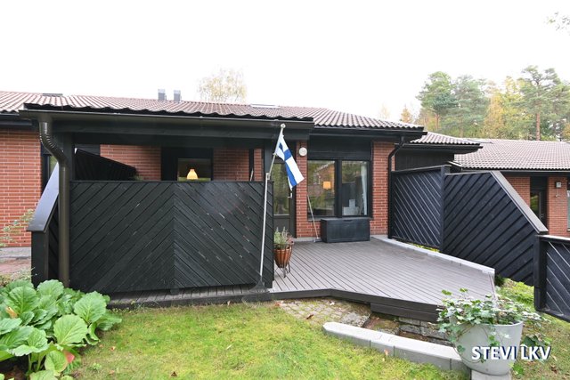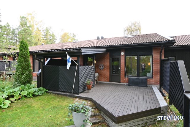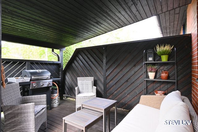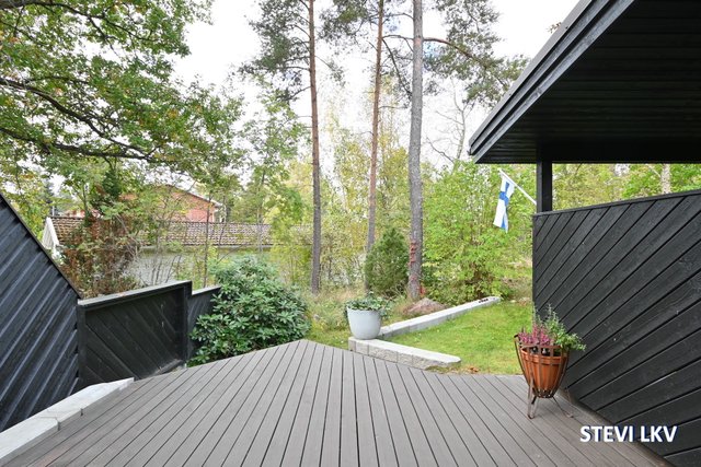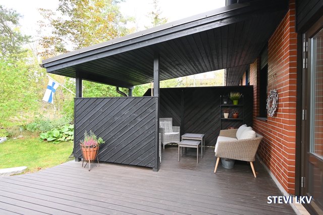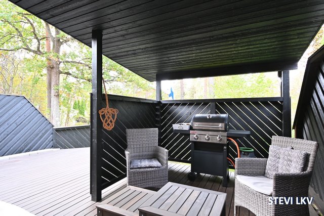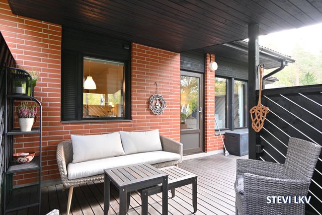 Terassi tarjoaa kivan oleskelutilan, johon pääsee grillailemaan. Osa terassista on katettua ja metsäiset maastot alkavat heti talon vierestä ja terassin päästä.