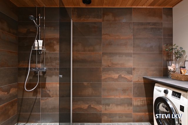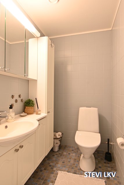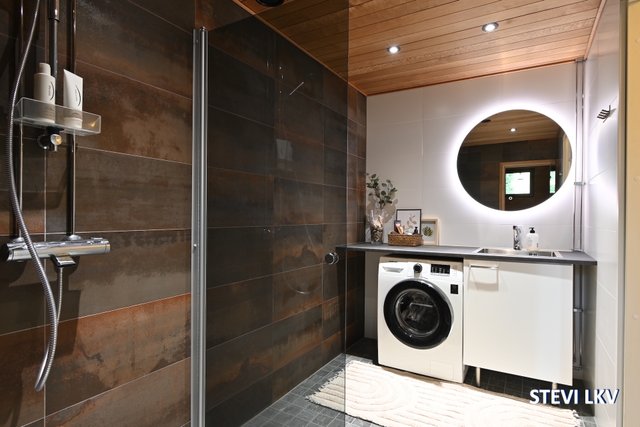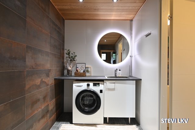 - Suihku, suihkuseinä, pesukoneliitäntä, lattialämmitys, peili, ja allaskaappi