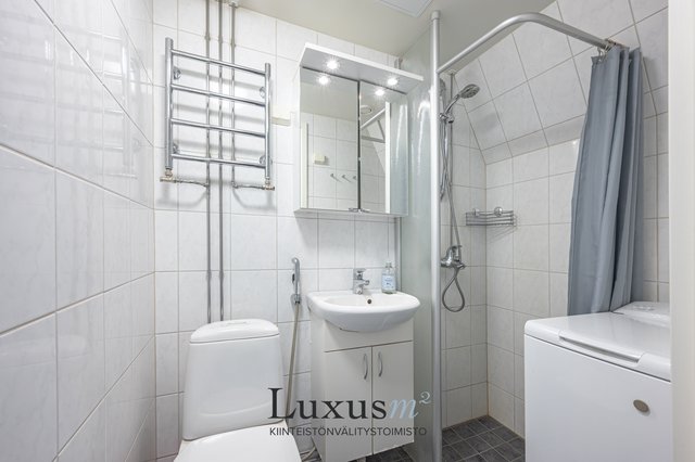 - Varustus: WC-istuin, suihku, pesukone, peilikaappi, pesuallas, allakaappi. Seinät: Kaakeli. Lattiat: Laatta.
