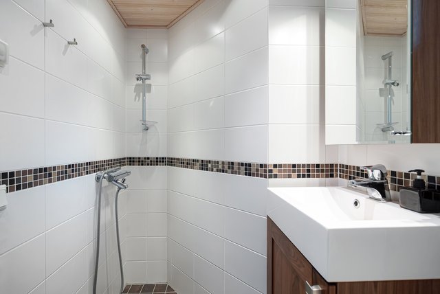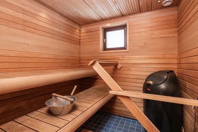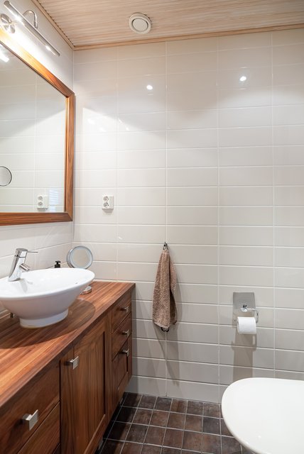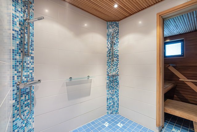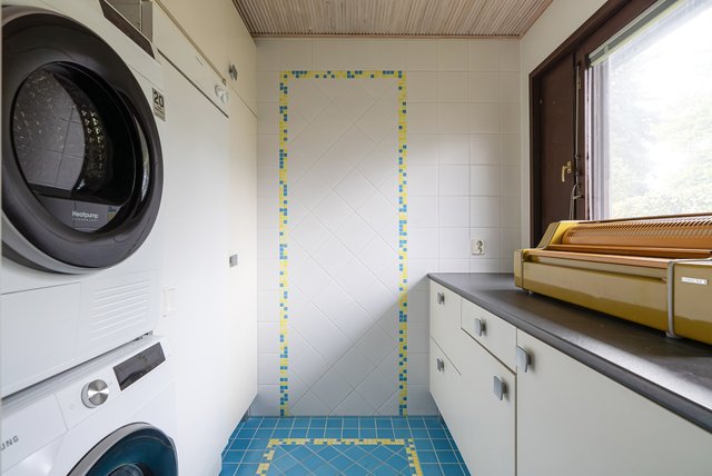 • Kaakeloitiin kaikkien märkätilojen lattiat ja seinät ja uusittiin vesikalusteet (kylpyhuone, sauna, 3 x wc, kodinhoitohuone)