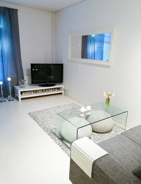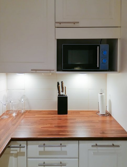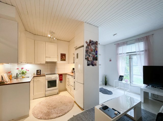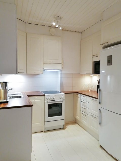 - Kaapistot, jääkaappi/pakastin, keraaminen liesi, uuni, pöytätiskikone (kaapissa), Seinät maalattu, välitila laattaa, mäntylattia.