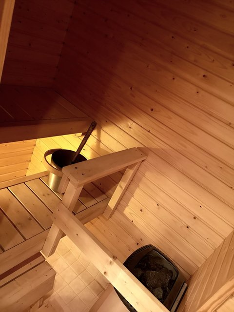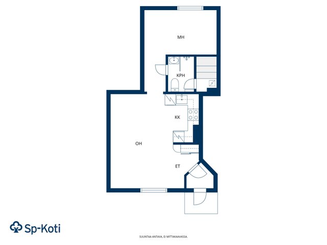Tupakeittiö, pieni makuuhuone, oma sauna ja oma erillinen kuistillinen sisäänkäynti. Asunnossa on vaaleaksi vahatut mäntylattiat ja lämmitysmuotona VILP/öljy. Keittiössä pieni pöytätiskikone ja runsaasti kaappitilaa.