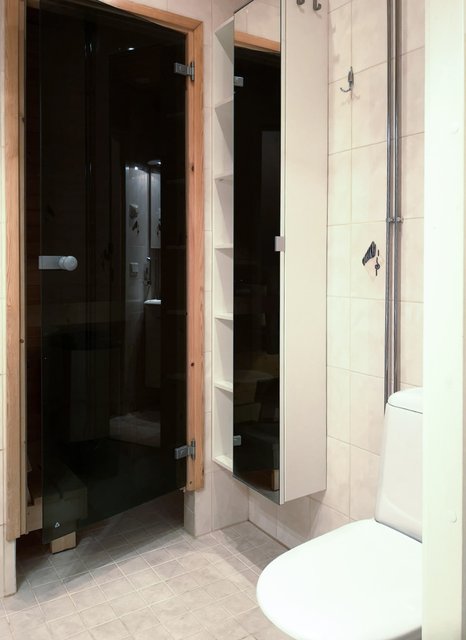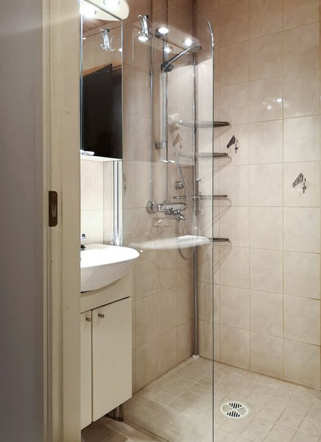 - Suihku, suihkuseinä, wc-istuin, pesuallas, peili- ja allaskaappi, pystykaappi. Seinät ja lattia laattaa.