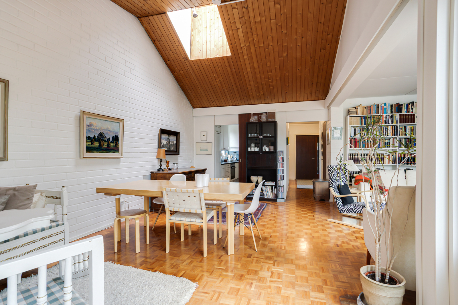 Nyt tarjolla Ihastuttava 1-tasoinen rivitaloasunto päättyvän kadun päässä Kauniaisissa. Ilmeikäs 60 -luvun arkkitehtuuri, korkea viisto katto sekä valkoiset tiiliseinät luovat asuntoon viihtyisän tunnelman. Olohuone, ruokailutila ja takkahuone muodostavat avaran kokonaisuuden yhteiseen oleskeluun. Tilassa oleva kattoikkuna tuo valoisaan tilaan vielä paitsi lisävaloa myös kivan yksityiskohdan. Olohuoneesta on käynti myös suojaisalle ja helppohoitoiselle terassipihalle.