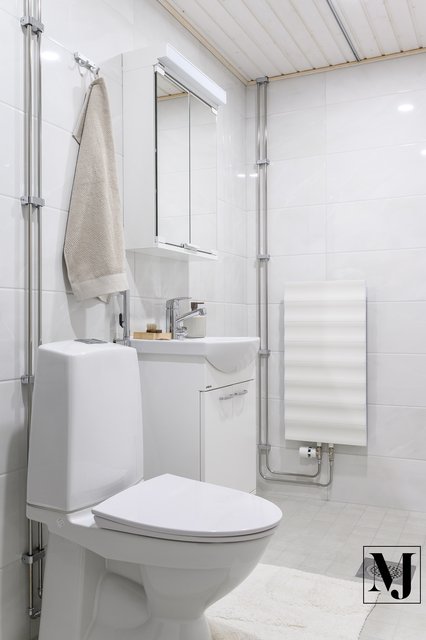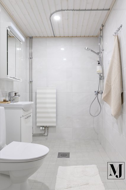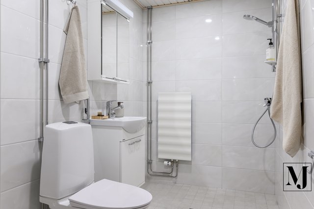 - WC-istuin, suihku, pesukoneliitäntä, lattialämmitys, peilikaappi, pesuallas, allaskaappi, ja bidee-suihku