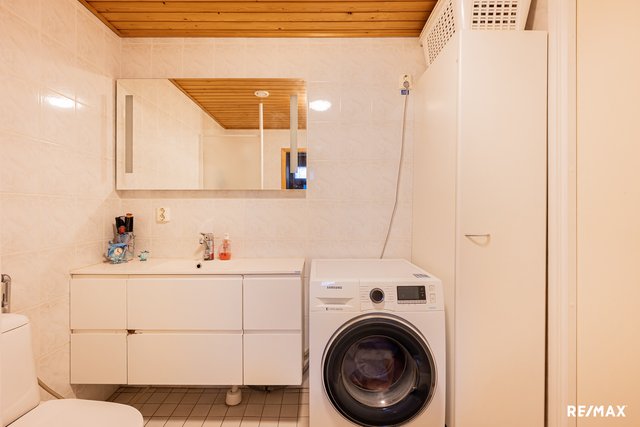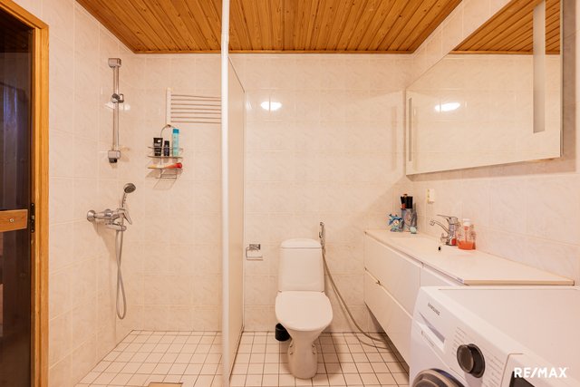 - Laatoitettu kylpyhuone, jossa suihku, suihkuseinä, allas, allaskaapisto, pesukoneliitäntä, peili sekä wc-istuin.