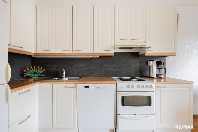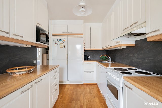 - Vaalein kaapistoin varustettu keittiö. Varustuksena jääkaappipakastin, astianpesukone, sähköliesi, liesituuletin.