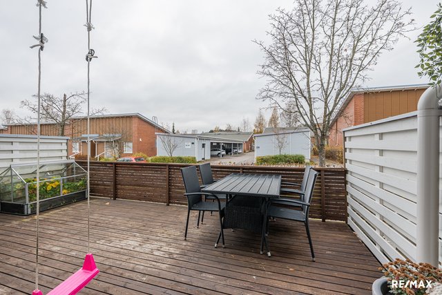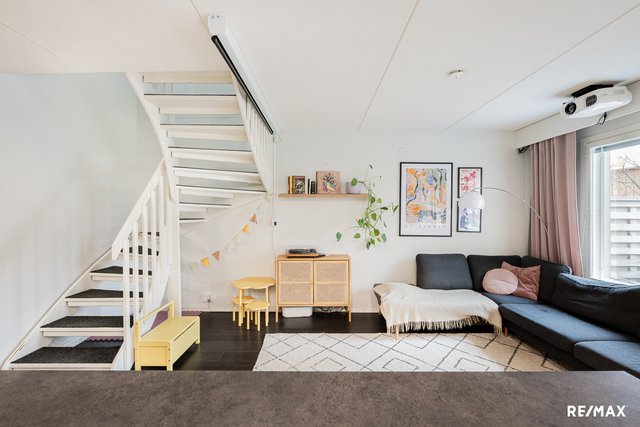Asunnossa on kaksi kerrosta ja 77,5 neliömetriä tilaa. Tyylikkäästi remontoidussa avokeittiössä on laadukkaat kodinkoneet ja keittiösaareke, joka luo käytännöllisyyttä ja avaruutta. Olohuoneesta on käynti omalle terassille, joka tarjoaa viihtyisän paikan rentoutumiseen. Yläkerran makuuhuoneista toisesta on pääsy lasitetulle parvekkeelle, mikä tuo lisätilaa ja valoa.