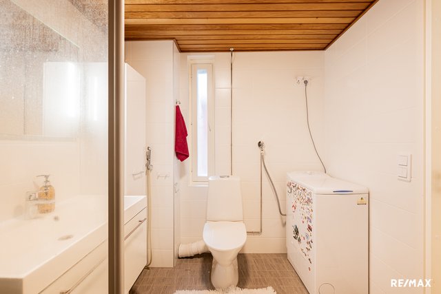 - Suihku, wc-istuin, suihkuseinä, pesukoneliitäntä, lattialämmitys, pesuallas, allaskaappi, ja peili