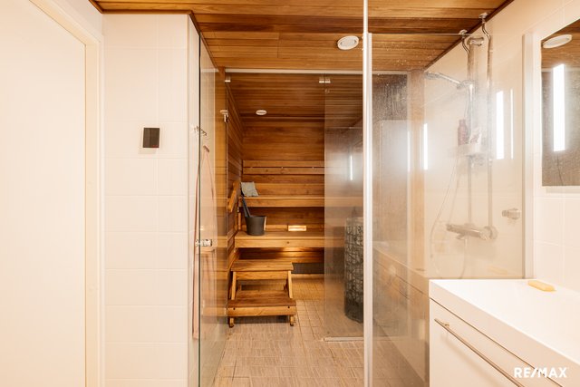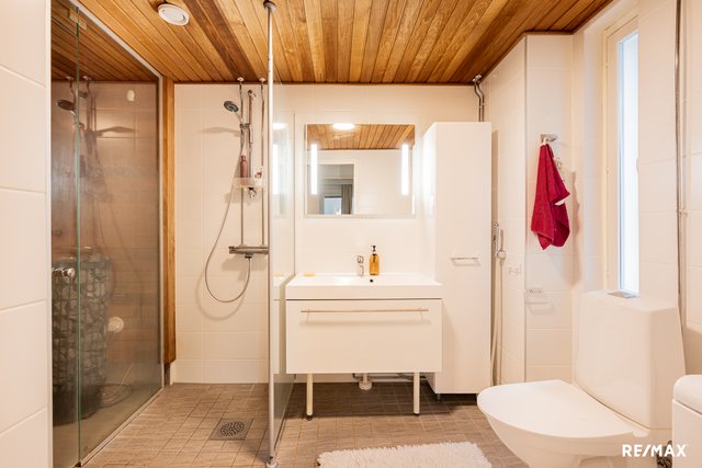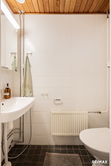 Kylpyhuone ja sauna on remontoitu vuonna 2021 putkiremontin yhteydessä, ja ne tarjoavat modernia mukavuutta. Asunnossa on myös erillinen wc, joka on uusittu samana vuonna. Säilytystilaa on runsaasti, sillä käytössä on vaatehuone, häkkivarasto ja kaapistot.