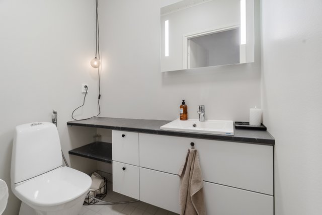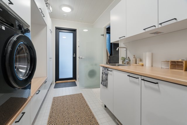 - Pesukoneliitäntä, lattialämmitys, pyykkikaapit, lattiakaivo, ja pesuallas