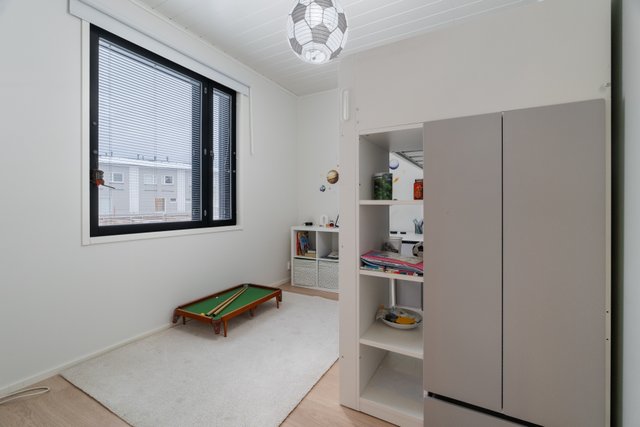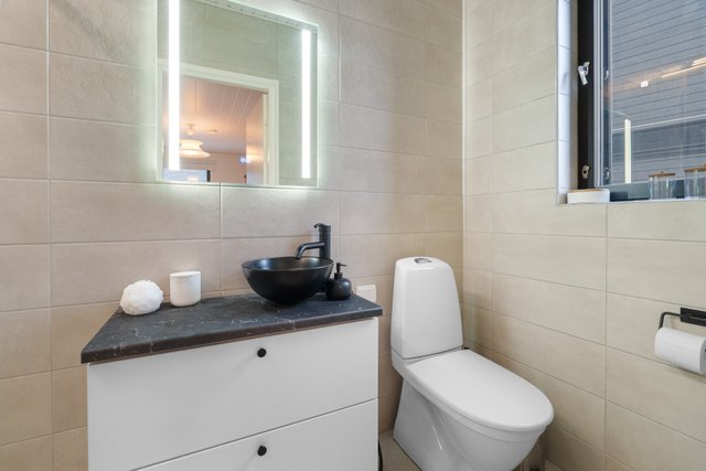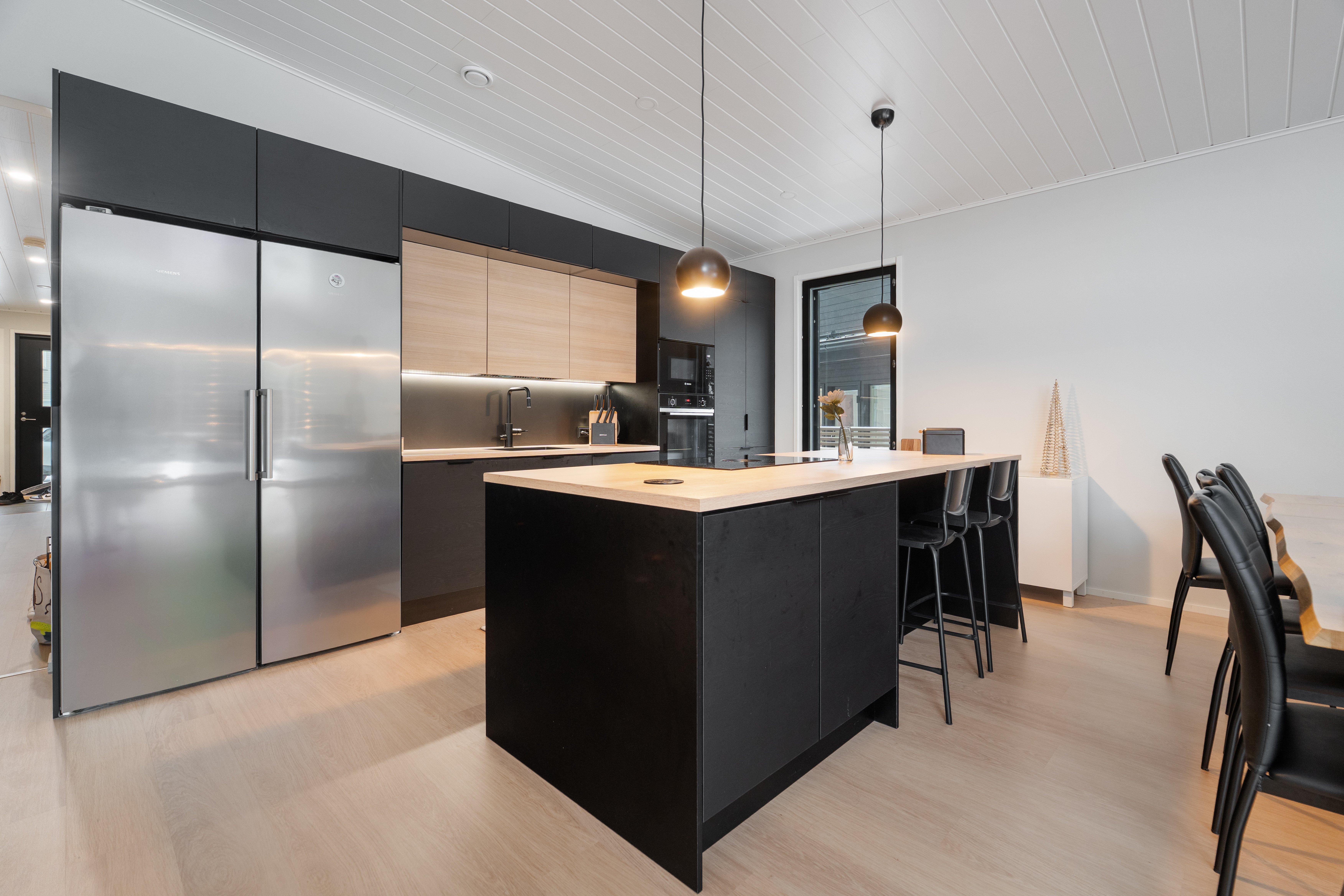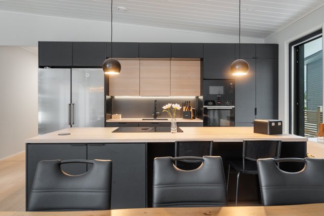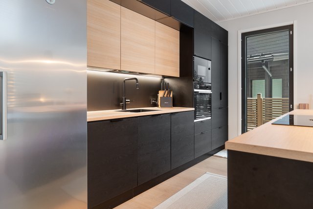 Tyylikäs keittiö mustan ja puun sävyissä. Rosterin väriset jääkaappi ja pakastin. Integroidut kodinkoneet. Suuri keittiösaareke erottaa keittiön olohuoneesta. Talossa on neljä tilavaa makuuhuonetta. Kaksi erillistä WC:tä sekä tilava kodinhoitohuone, jossa on runsaasti kaappitilaa. Tilava kylpyhuone, jossa on kaksi suihkua. Kylpyhuoneen yhteydessä myös lasiseinäinen sauna.