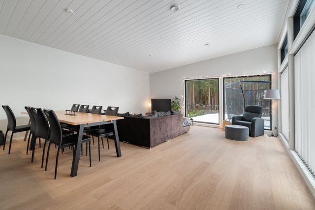 Olohuone ja keittiö ovat yhtenäistä avointa tilaa, ja suuret ikkunat tuovat runsaasti luonnonvaloa huoneeseen. Takapihalta näkymät metsän suuntaan, suojaisa piha.