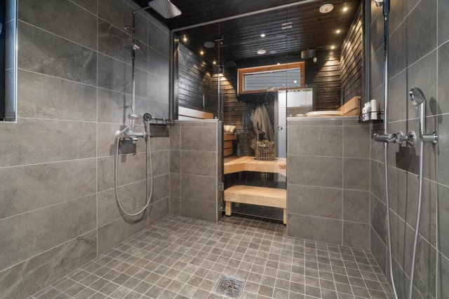 - Iso suihkuhuone missä kaksi suihkua, suihkuhuoneen yhteydessä sauna.