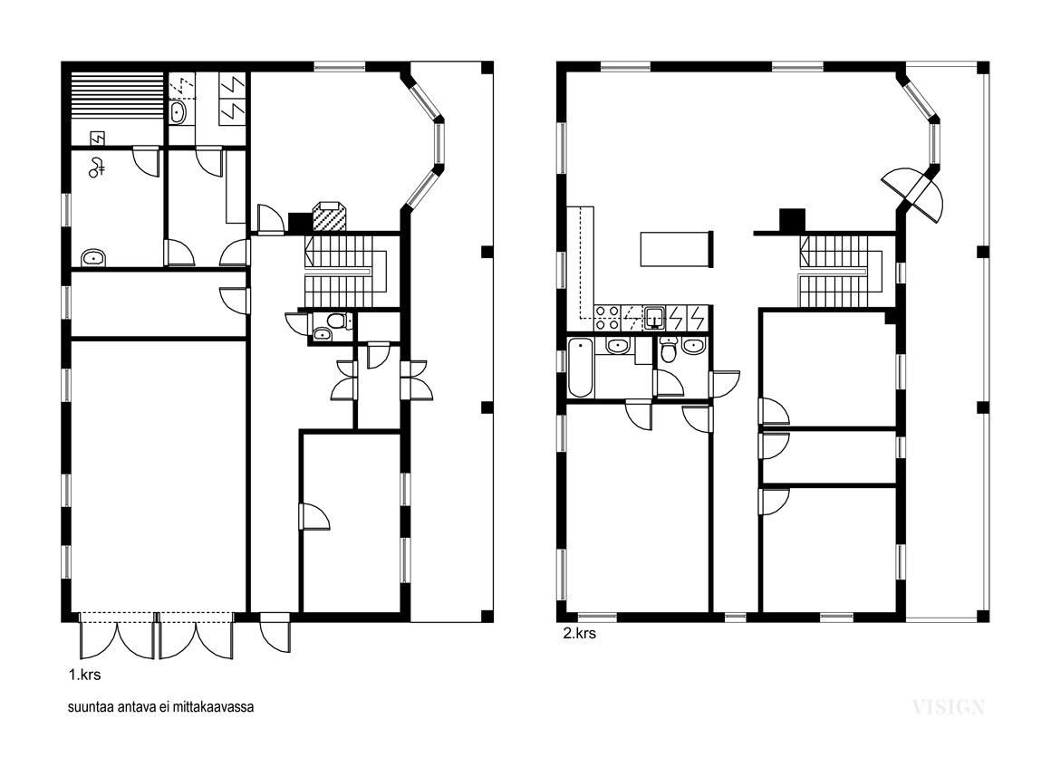Yläkerroksessa on kolme makuuhuonetta, olohuone, keittiö, kylpyhuone ammeella, wc ja vaatehuone. Suurimmassa makuuhuoneessa on varaus kahdeksi makuuhuoneeksi jakamisesta väliseinän ja yhden oviaukon rakentamalla. Kellarikerroksessa on makuu-/työhuone, saunaosasto, takkahuone, kodinhoitohuone, varasto-/työtiloja ja tilava kahden auton autotalli.