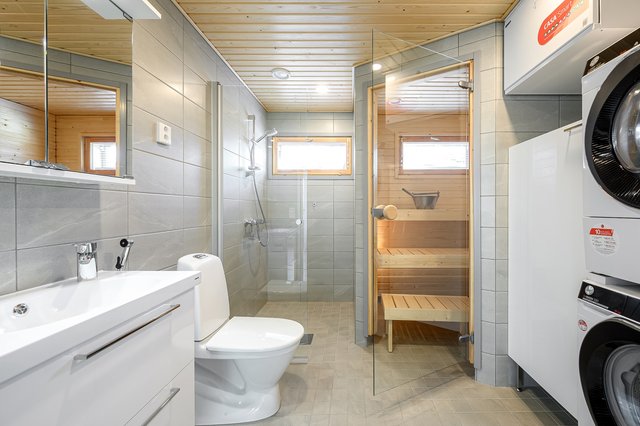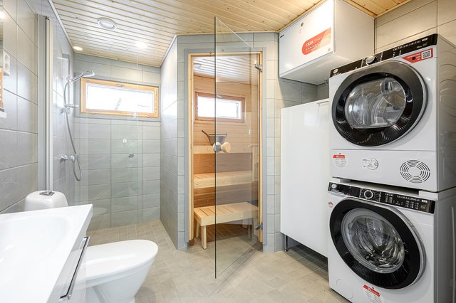- WC-istuin, suihku, suihkuseinä, pesukoneliitäntä, pesukone, kuivausrumpu, lattialämmitys, ja peilikaappi