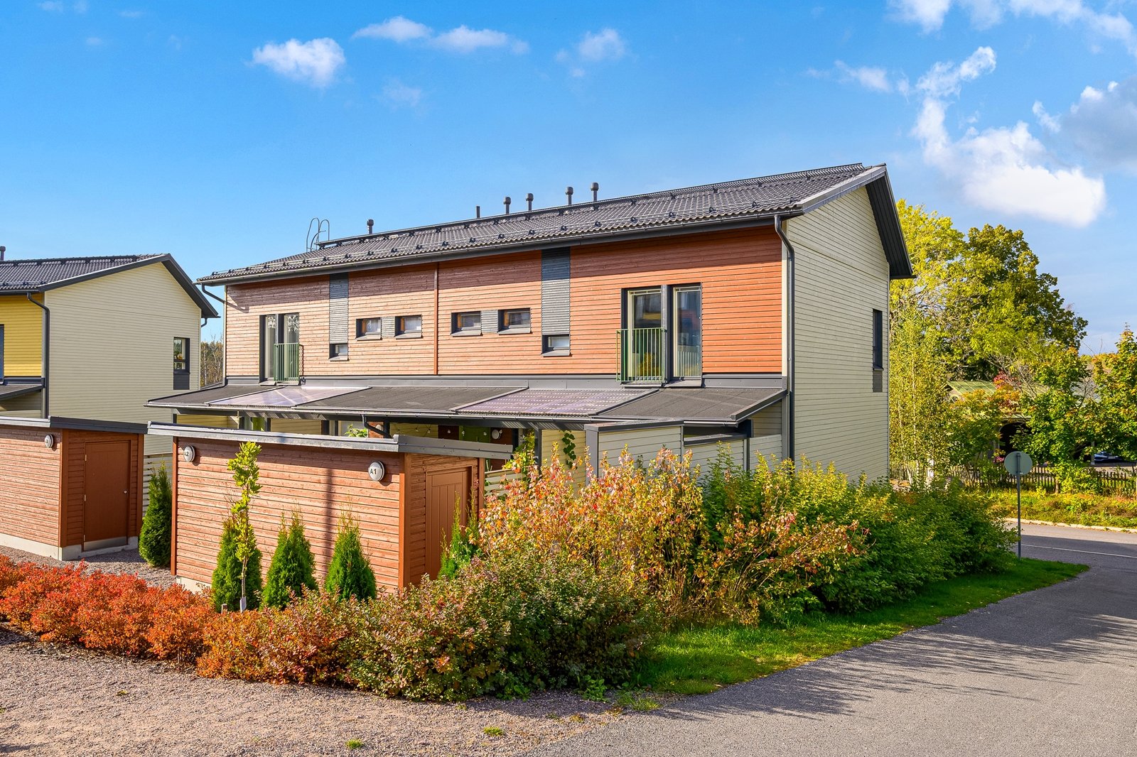 Asunnon tilat ovat kahdessa kerroksessa, asuntoon on oma sisäänkäynti sen edessä olevan oman piha-alueen kautta. Alakerran aulassa on hyvät tilat vaatesäilytykseen, yläkerrassa on valoisa olohuone, hyvin varusteltu keittiö, kaksi makuuhuonetta, vaatehuone ja sauna pesutiloineen. Alakerran katettu terassi tuo lisätilaa sekä mahdollisuuden nauttia ulkoilmasta omassa rauhassa, ranskalainen parveke yläkerrassa tuo puolestaan lisää valoa ja ilmavuutta asuntoon.