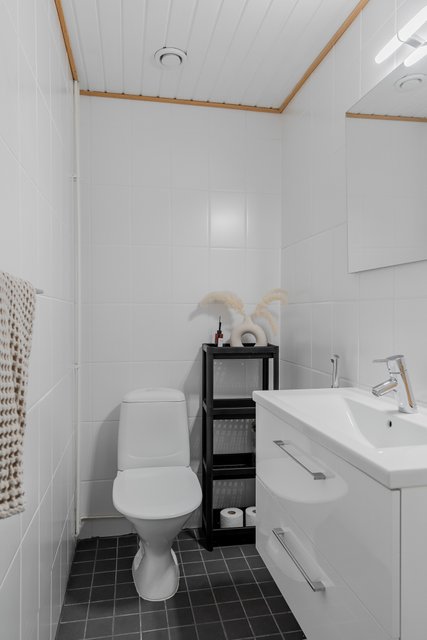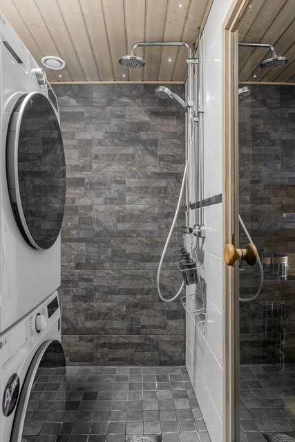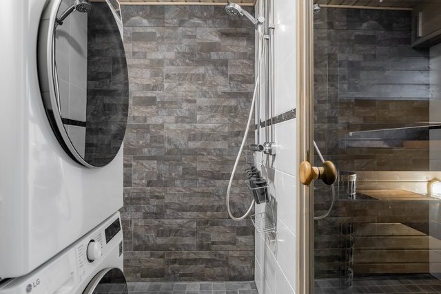 Lisäksi asunnossa erillinen WC, joten suihkutila on vain pyykkäystä ja suihkuttelua varten.