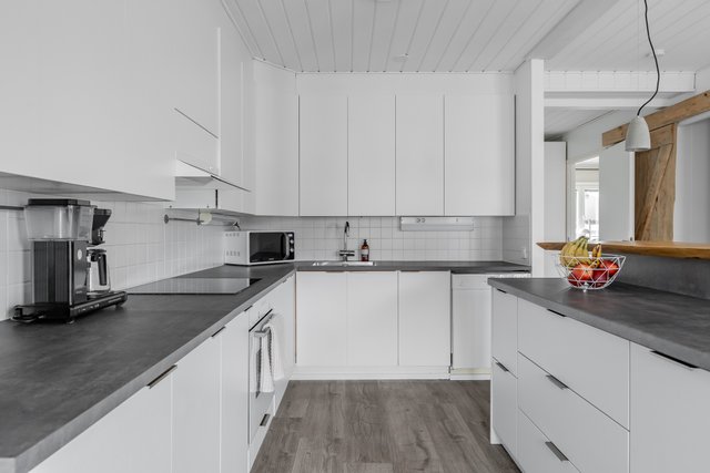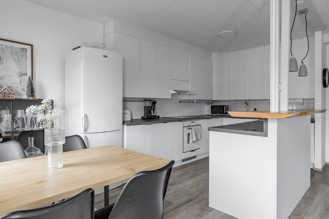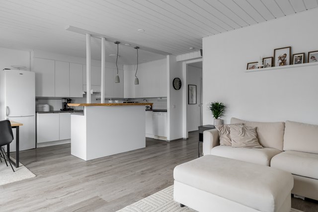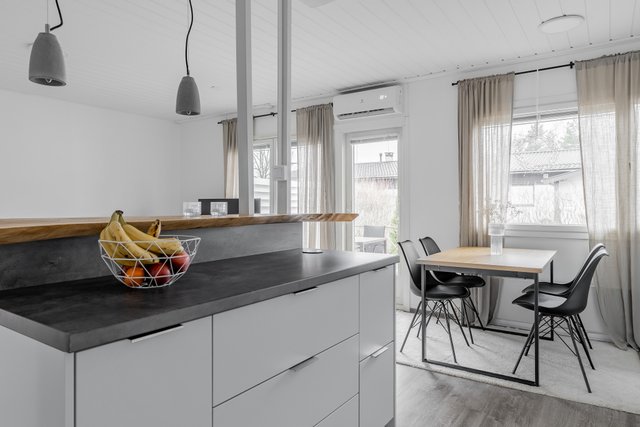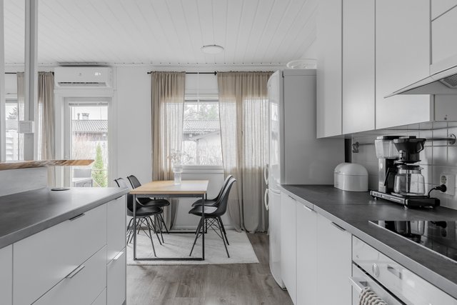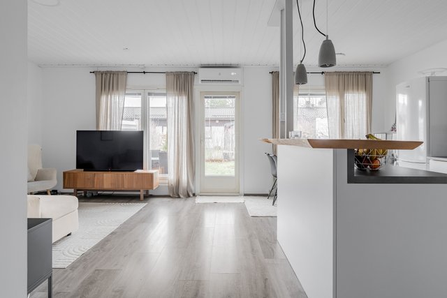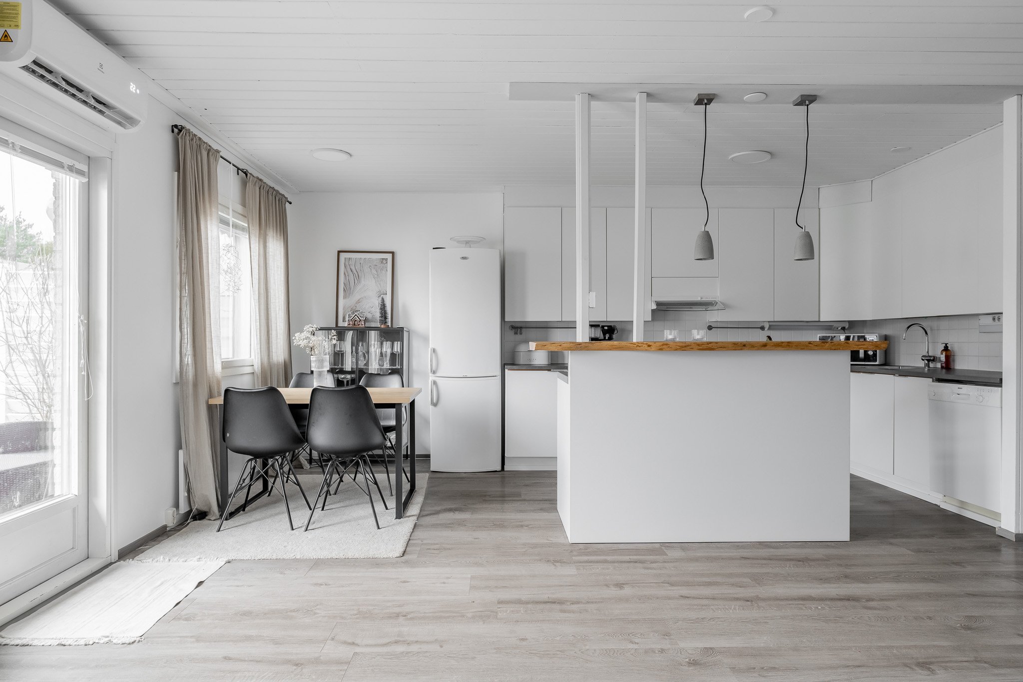 Keittiö eli kodin moottori yhdistettynä kodin sydämeen, eli olohuoneeseen suurilla miltei lattiasta kattoon ulottuvilla ikkunoilla muodostavat modernin, valoisan tilan, jossa elämä oikeasti mahtuu tapahtumaan.
