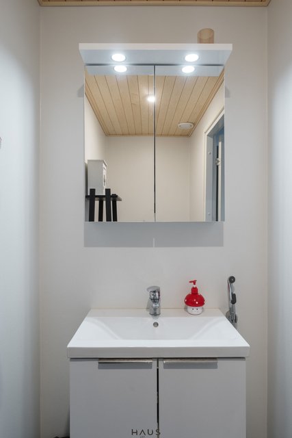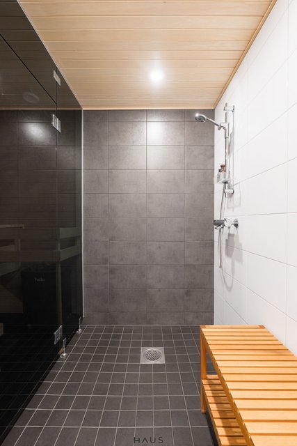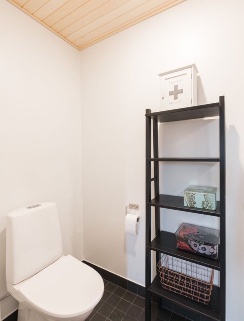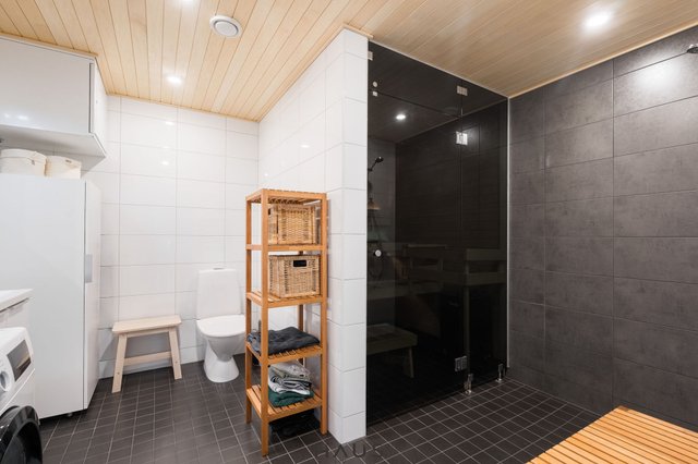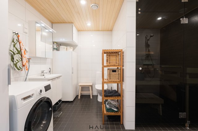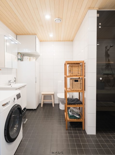 - WC-istuin, suihku, pesukoneliitäntä, peilikaappi, pesuallas, allaskaappi, ja bidee-suihku