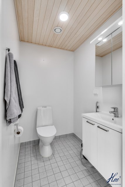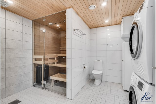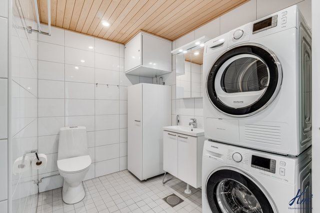 - WC-istuin, pesukone, kuivausrumpu, pesukoneliitäntä, sadesuihku, allaskaappi, ja peilikaappi