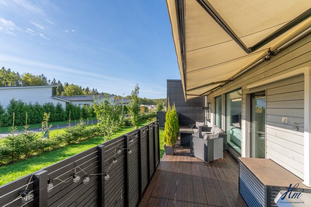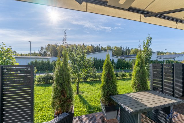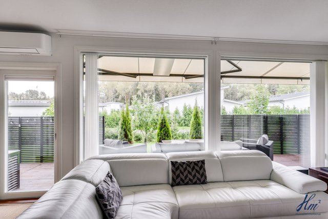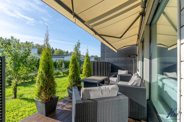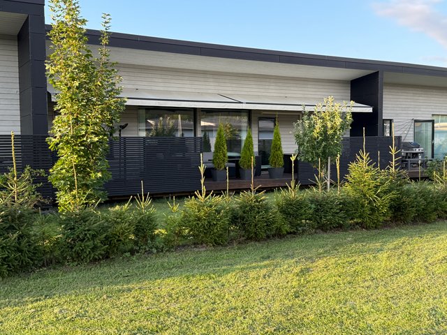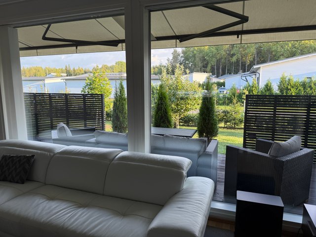 - Takapihan terassilla koko terassin kattava markiisi automatiikalla.