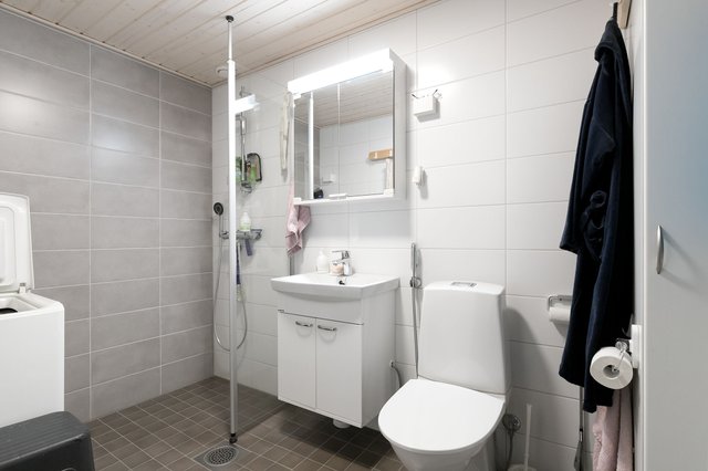 - WC-istuin, suihku, pesuallas, lattialämmitys, peilikaappi, ja pesukoneliitäntä