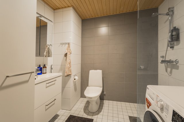 - WC-istuin, suihku, suihkuseinä, pesukoneliitäntä, lattialämmitys, peilikaappi, allaskaappi, bidee-suihku, ja pesuallas