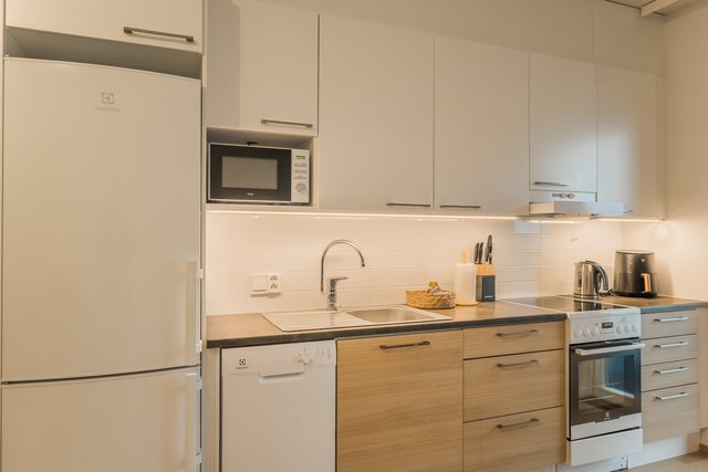 - Jääkaappipakastin, uuni, liesi, astianpesukone, ja liesituuletin