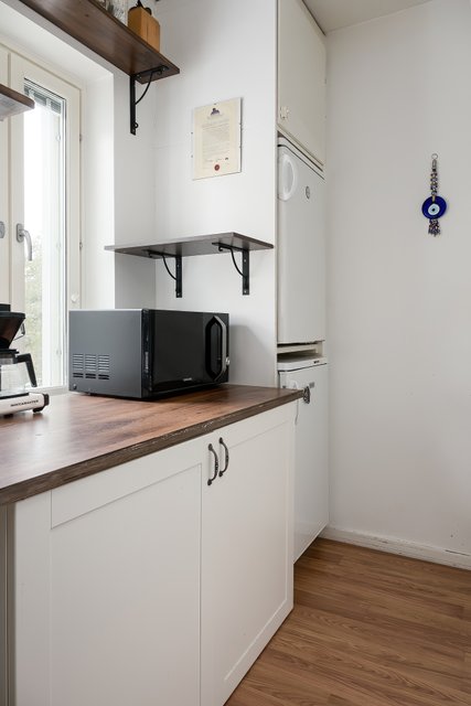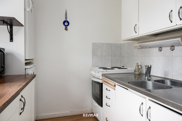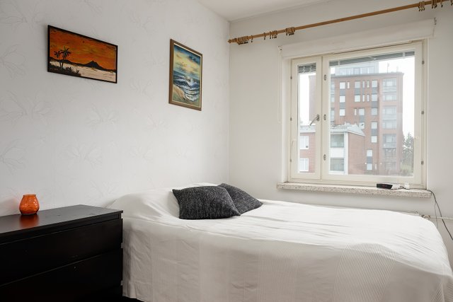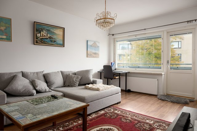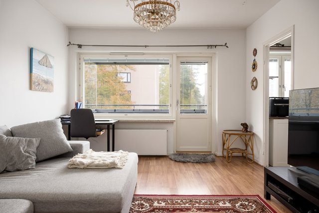 Tämä valoisa kaksio tarjoaa juuri sitä, mitä moni toivoo: fiksusti suunnitellut neliöt, tilavat huoneet ja rauhallisen sijainnin. Asunto sijaitsee ylimmässä kerroksessa päädyssä, joten naapureita on vain yhden seinän takana. Keittokomerossa kaikki on kätevästi käden ulottuvilla ja iso ikkuna tuo ihanasti luonnonvaloa ruoanlaittoon. Kylpyhuone on kaakeloitu kauttaaltaan ja vaikka remontista onkin jo tovi, tila on siisti ja pyykinpesukoneellekin löytyy oma paikkansa.