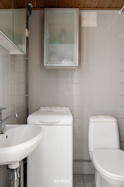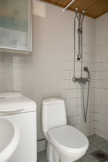 - WC-istuin, lattialämmitys, peilikaappi, pesuallas, pesukoneliitäntä, ja suihku