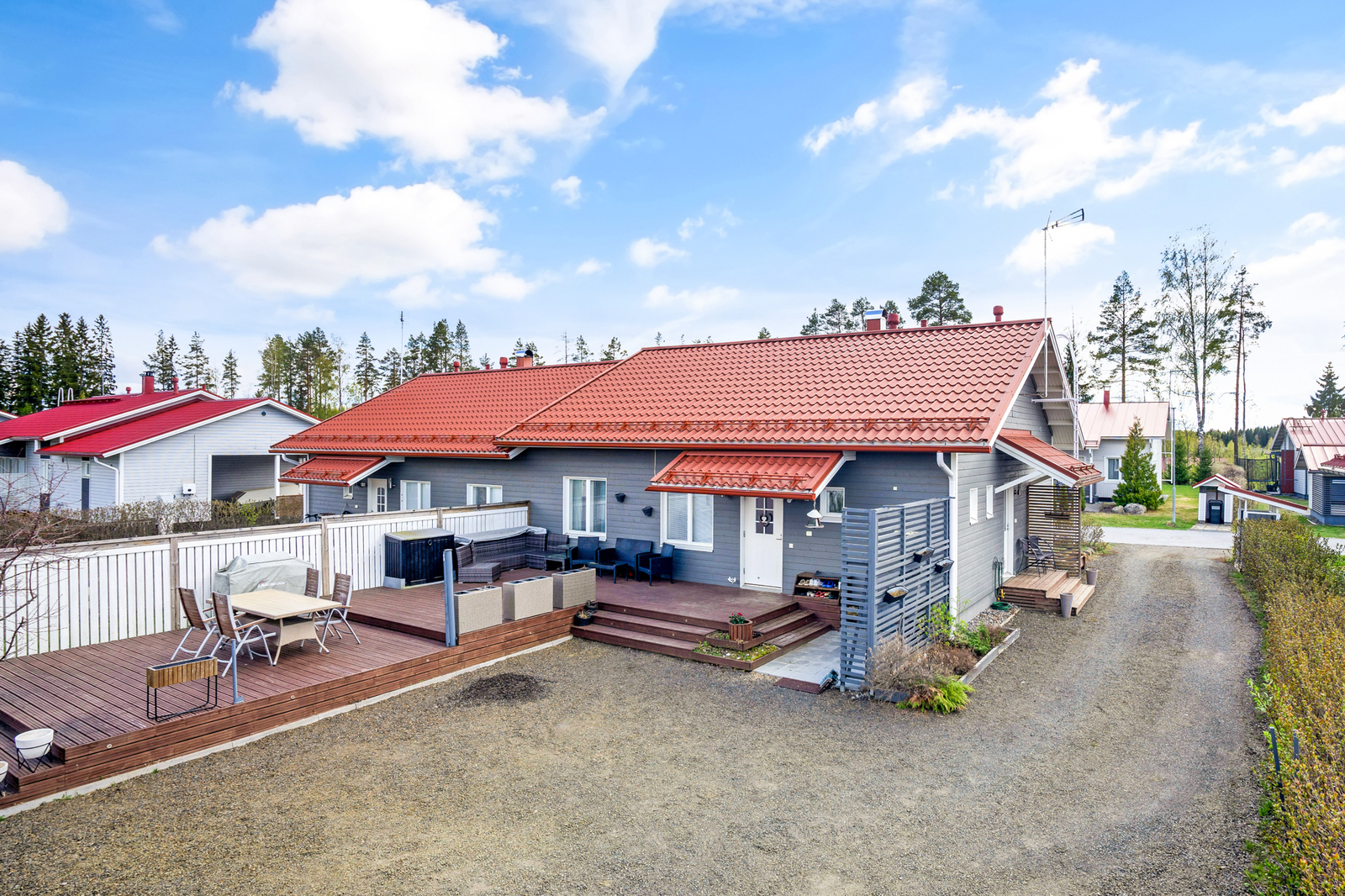 Kotiketun mielestä tämän kodin paras paikka löytyy sisäpihalta. Täällä pystyy seurustelemaan, grillailemaan sekä nauttimaan ajasta perheen kesken.