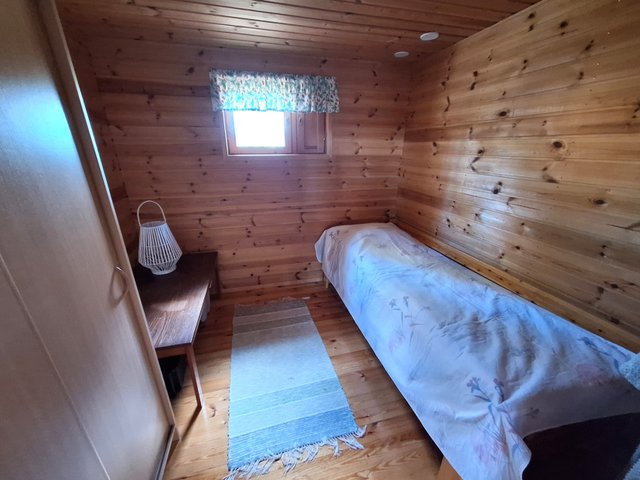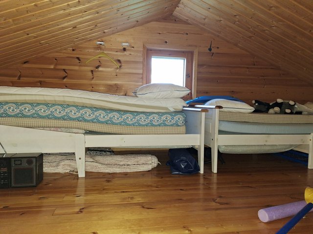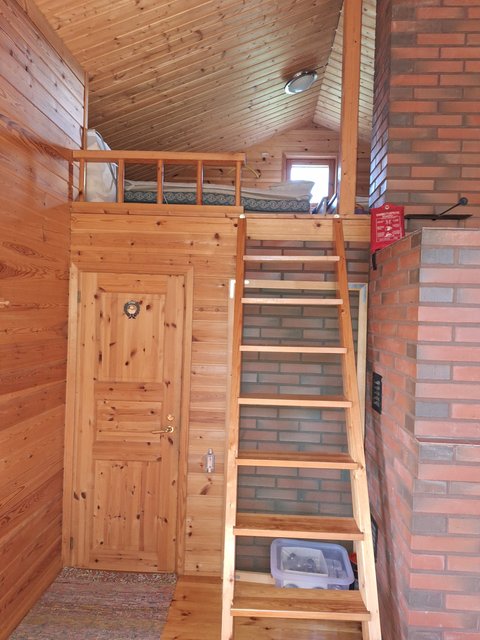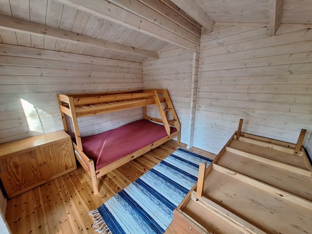 Makuuhuoneen lisäksi tilaa yöpymiselle matalalla parvella sekä erillisessä nukkuma-aitassa.