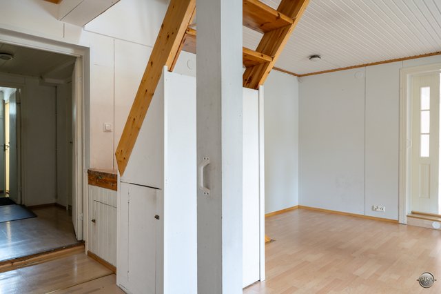 Tontilla sijaitsee nyt 75 m2 kahden makuuhuoneen pieni talo, johon on tehty vuosien varrella useita muutoksia, mutta siitä huolimatta koti kaipaa päivittämistä tämän päivän asumisen vaatimusten tasolle. Sen vuoksi talo myydäänkin remontoitavassa kunnossa.