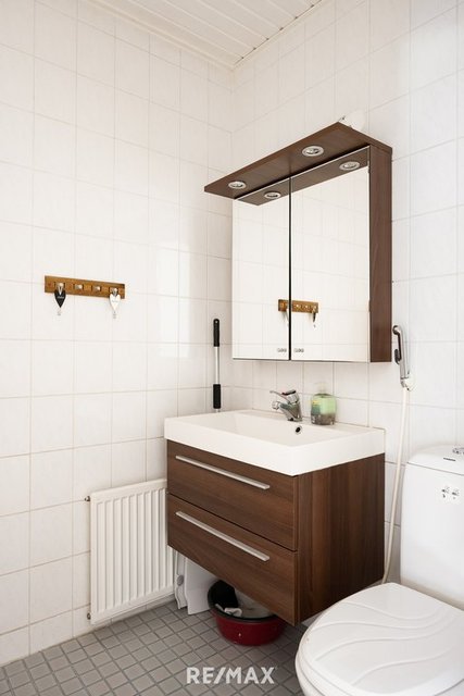 - Suihku, suihkuseinä, lattialämmitys, peilikaappi, ja allaskaappi