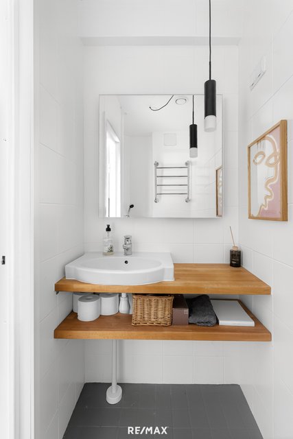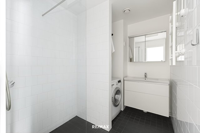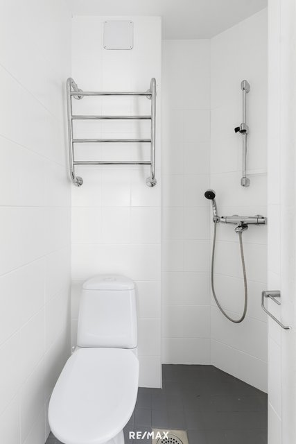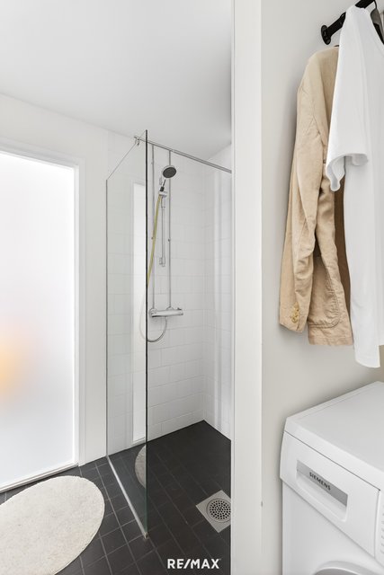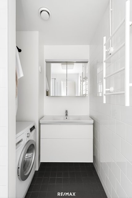 - Suihku, pesukoneliitäntä, lattialämmitys, pesukone, suihkuseinä, allaskaappi, ja peilikaappi