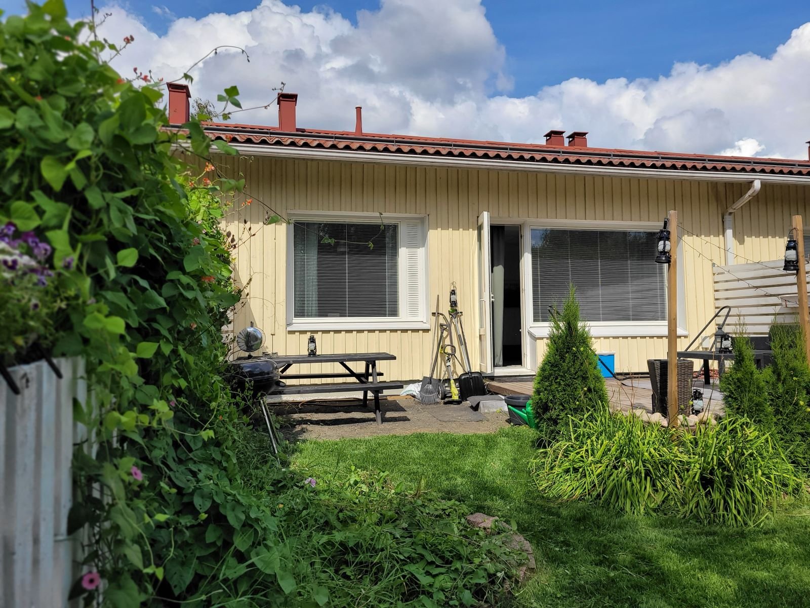 - aurinkoinen terassi ja piha etelään, makuuhuoneet pohjoiseen