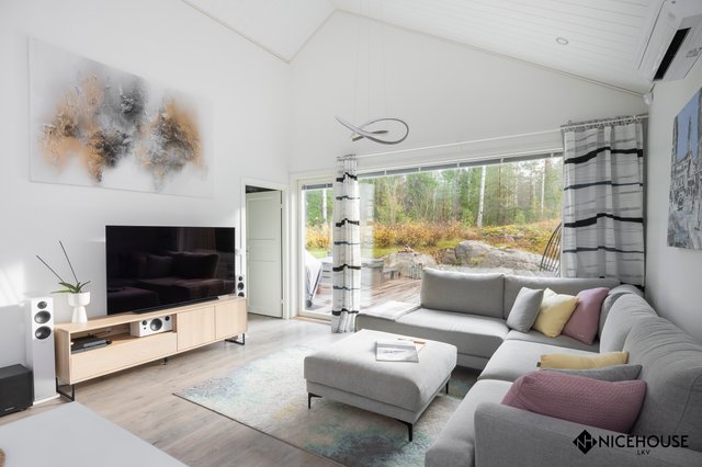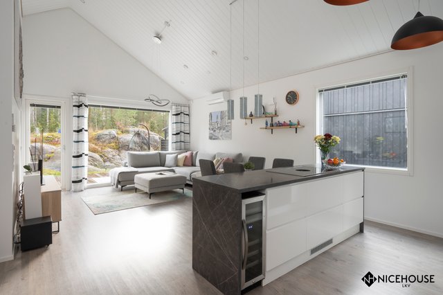 - Valoisa olohuone, joka on korkeaa tilaa. Olohuoneen isot ikkunat rauhallisen metsän suuntaan.